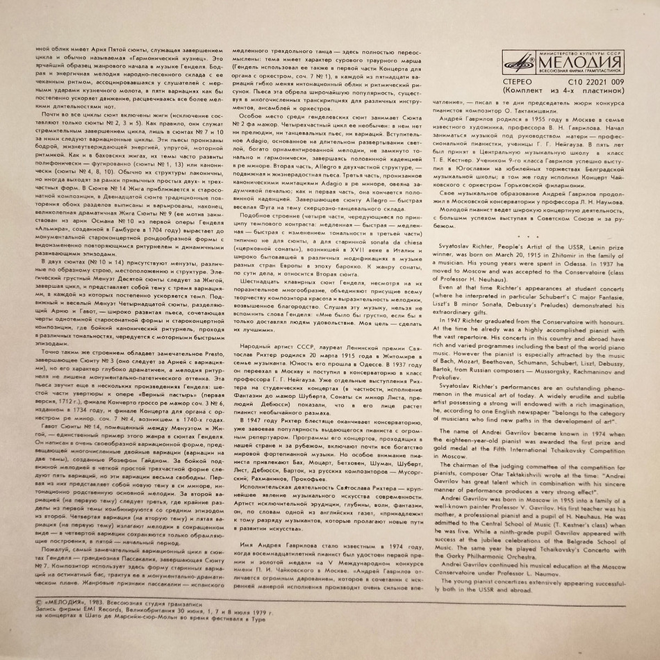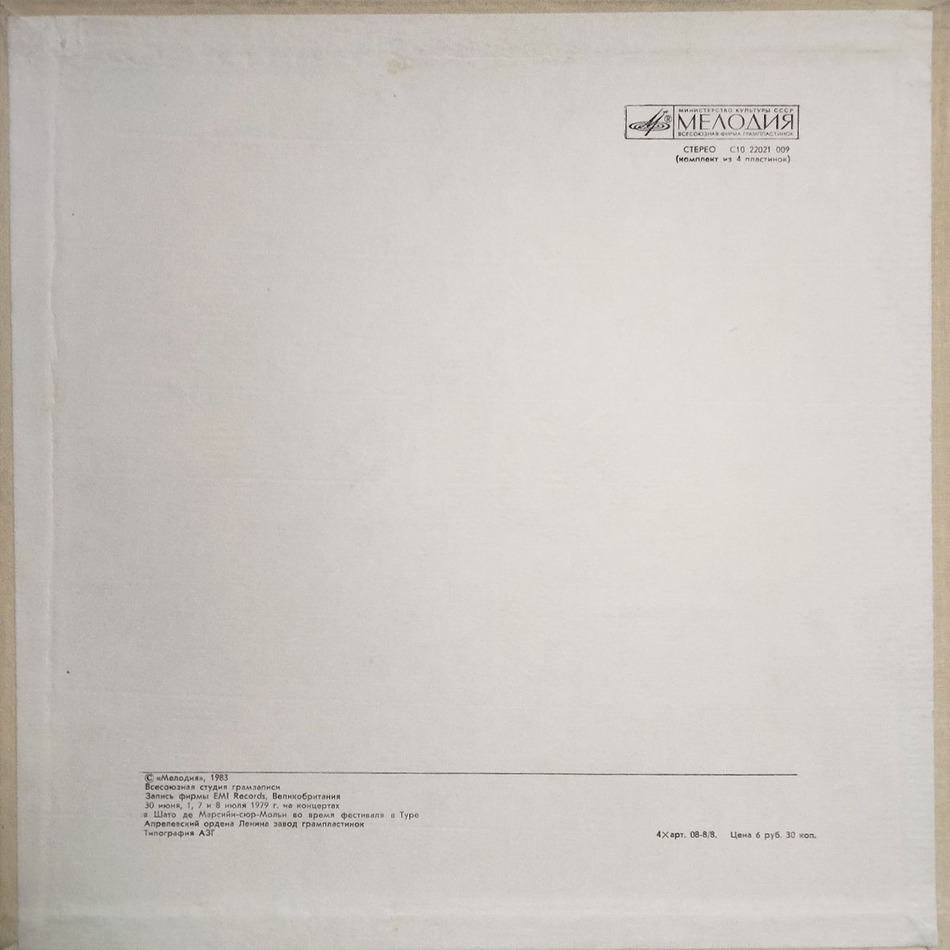 Советское бокс-сет издание 1983 года на четырех виниловых пластинках черного цвета. Содержит 4-страничную вкладку. Открытый бокс в превосходном состоянии. Винил в идеальном состоянии. Лейблы белые.