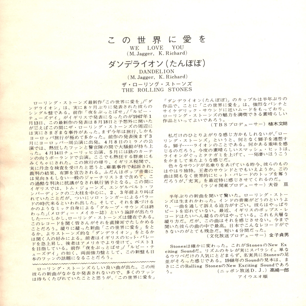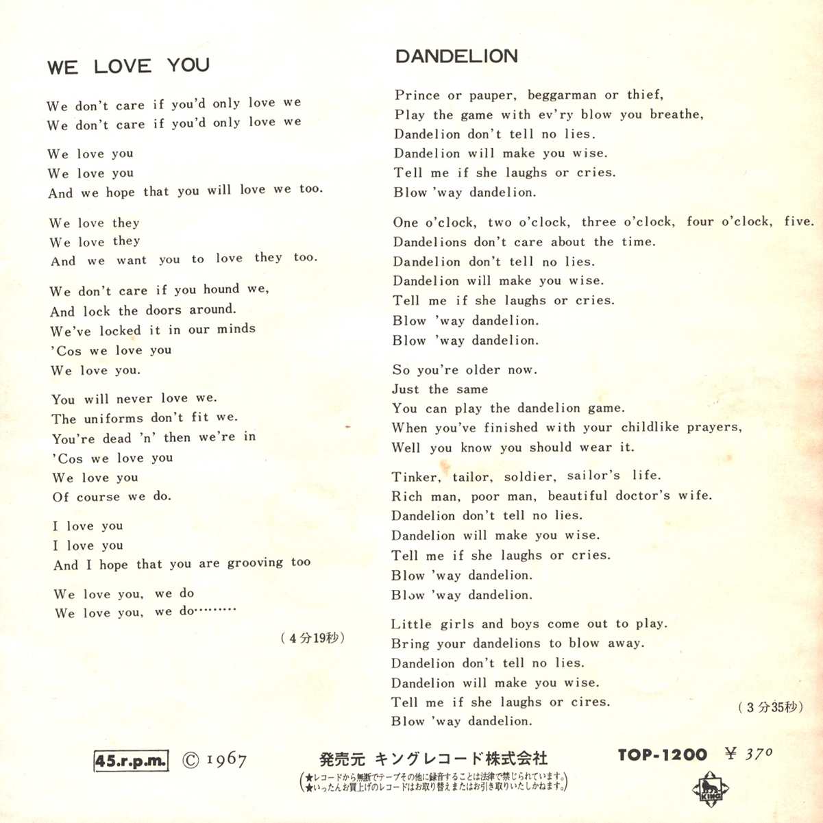 Японское издание на 7-дюймовом чёрном виниле. Содержит вкладку с подробной биографией на японском языке на одной стороне и текстами обеих композиций на английском языке на обратной стороне. Скорость записи 45 RPM. Конверт в состоянии, близком к идеальному, винил в превосходном состоянии.