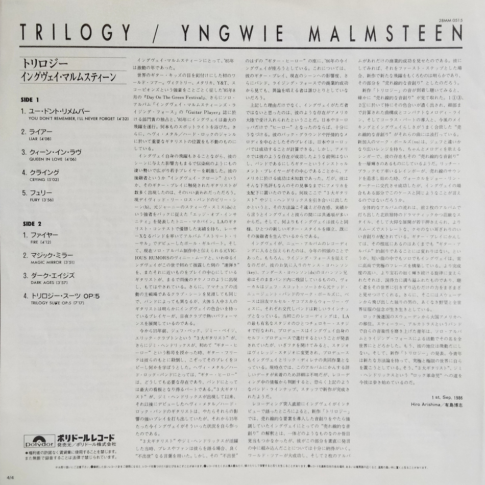 "Trilogy"- третий студийный альбом шведского гитариста-виртуоза Ингви Мальмстина, выпущенный в 1986 году. Альбом является одним из первых и немногих зарубежных хэви-метал альбомов, выпуск которых был официально разрешен на территории СССР. В 1989 году Ингви впервые посетил СССР с туром "Live in Leningrad: Trial By Fire". Альбом посвящён памяти премьер-министра Швеции Улофа Пальме, застреленного в Стокгольме 26 февраля 1986 года.
