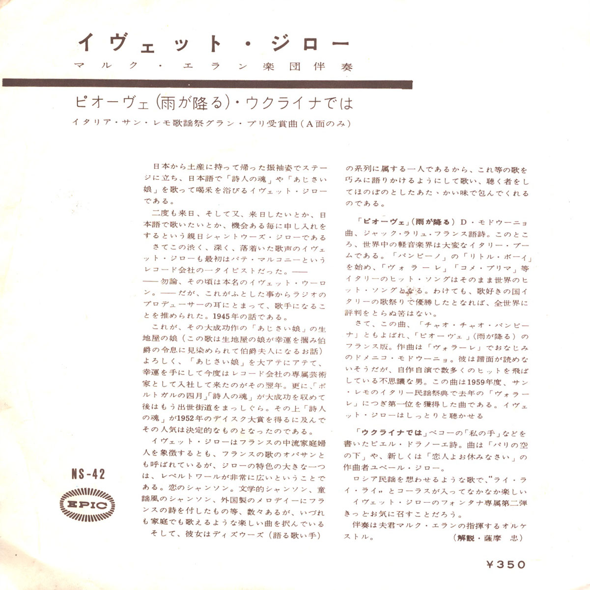 Иветт Жиро - французская певица. Период расцвета её творчества приходится на 50-е годы прошлого века. Иветт Жиро была известна не только во Франции, но и в других странах. Певица подолгу жила в Японии и пользовалась большой популярностью у японской публики. За свою музыкальную карьеру Иветт Жиро была награждена Орденом Драгоценной короны от Японского императора и удостоена звания Командора Ордена Искусств и Литературы от правительства Франции.