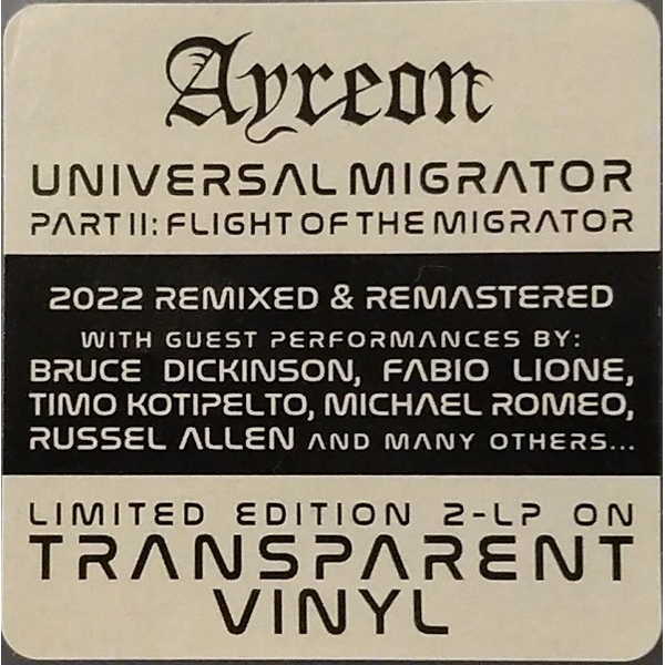 "Universal Migrator Part 2: Flight of the Migrator" - пятый студийный альбом группы Ayreon, вышедший в 2000 году. Жанр пластинки определяют, как "прогрессив метал/рок-опера". В записи альбома участвовали Брюс Дикинсон (Iron Maiden), Фабио Тордильоне (Rhapsody of Fire), Тимо Котипелто (Stratovarius), Майкл Ромео (Symphony X), Рассел Аллен (Symphony X) и многие другие.