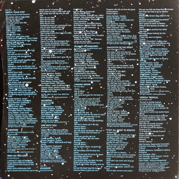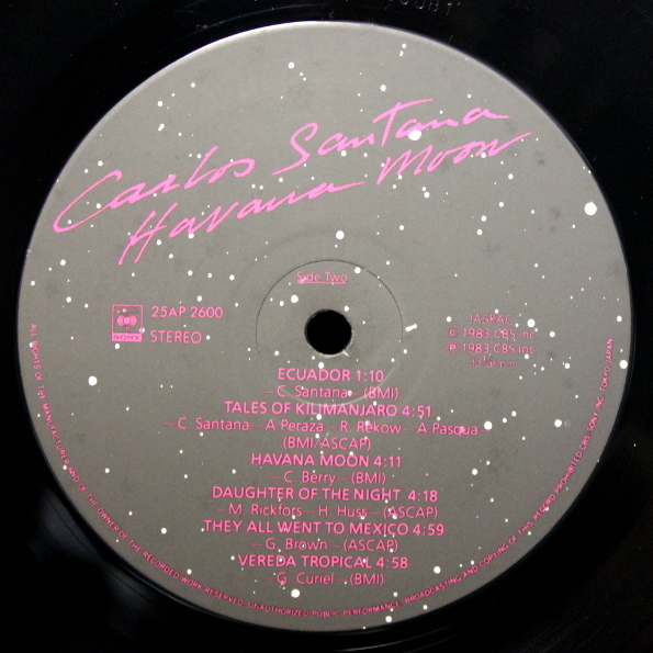 Японское издание альбома "Havana Moon" 1983 года, сольной работы американского гитариста Карлоса Сантаны. В работе над этим диском приняли участие музыканты Booker T & the MGs, Вилли Нелсон, Джимми Вон и The Fabulous Thunderbirds, а также отец Карлоса - Хосе, он исполнил вокальную партию в песне "Vereda Tropical". Кроме своих композиций Сантана также записал для этого альбома несколько кавер-версий, в том числе на песни Чака Берри и Бо Дидли.