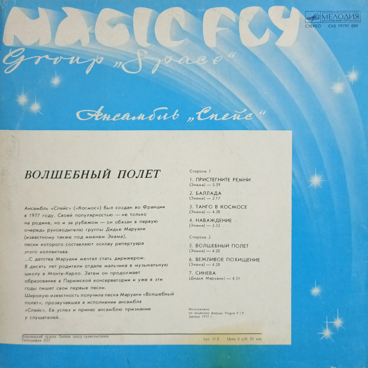 "Magic Fly" - советское издание дебютного студийного альбома французской группы Space, вышедшего в 1977 году. Заглавная песня "Magic Fly" использовалась в качестве звукоряда к телевизионным кадрам посадки "Бурана". В СССР альбом вышел под названием "Ансамбль "Спейс" - Волшебный полет". В советском релизе трек "Carry On, Turn Me On" по идеологическим соображениям был заменён на композицию "Just Blue" (Синева) из одноимённого альбома 1978 года.