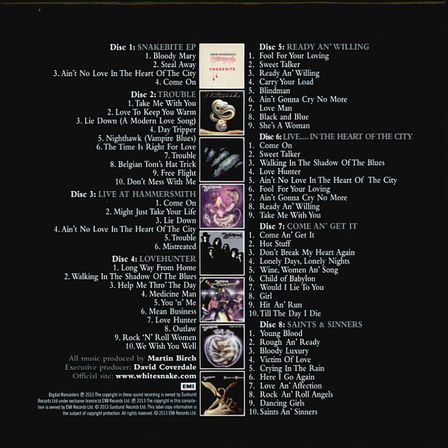 Бокс-сет "Little Box 'O' Snakes - The Sunburst Years 1978-1982" от британских рокеров из Whitesnake, выпущенный в 2013 году. В него вошли ремастированные версии пяти студийных альбомов: "Trouble" (1978), "Lovehunter"(1979), "Ready An' Willing" (1980), "Come An' Get It" (1981), "Saints &, Sinners" (1982) и двух концертных альбомов "Live At Hammersmith" (1978), "Live.... In The Heart Of The City" (1980), а также EP "Snakebite", которые группа Whitesnake записала с 1978 по 1982 год. В записи альбомов Whitesnake участвовали разные музыканты, так как состав группы часто менялся. Некоторые из этих релизов достигали высоких позиций в чартах Великобритании, а "Ready an&rsquo, Willing" (1980) стал первым, который пробился в международные чарты. Но самым успешным для коллектива стал "Come an' Get It" (1981), который достиг 2-го места в Великобритании. Издание представлено на 8-ми CD дисках и содержит 16-страничный буклет. Британо-американская хард-рок группа Whitesnake была основана в 1977 году бывшим вокалистом Deep Purple Дэвидом Ковердэйлом. Многие работы коллектива занимали высокие позиции в хит-парадах Британии и США, всего же было выпущено 12 студийных альбомов и 4 концертных. Группа записывается и гастролирует до сих пор.