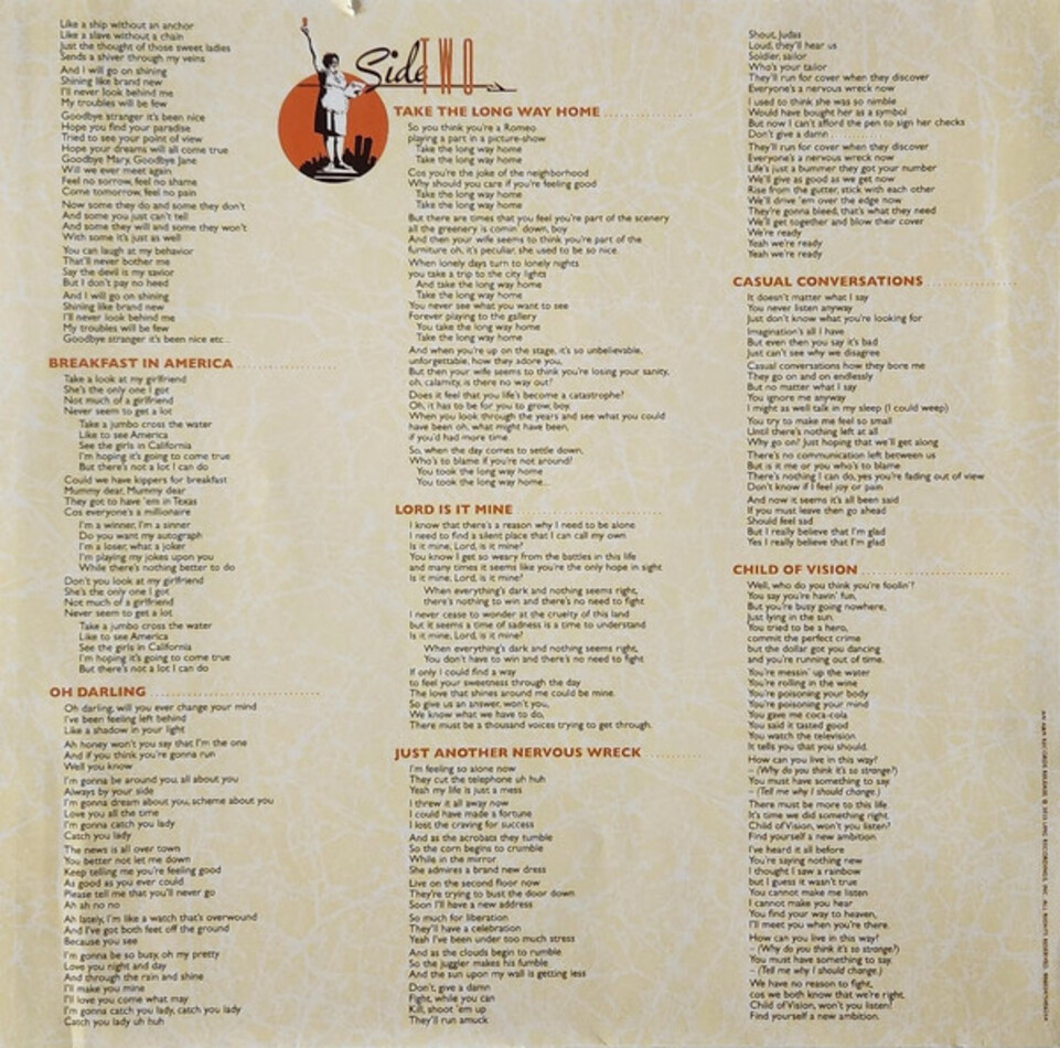 "Breakfast In America" - студийный альбом британской рок-группы Supertramp, первоначально выпущенный в 1979 году. Альбом попал на первую строчку чартов США, Австралии, Канады и на 3-е место в Великобритании. На данный момент продано более 20 миллионов экземпляров этого альбома.