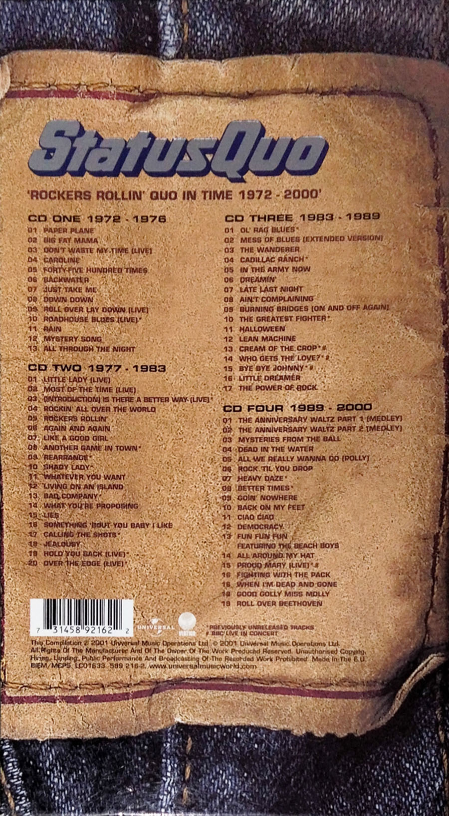 "Rockers Rollin' Quo In Time 1972 - 2000" - сборник группы Status Quo, вышедший в 2001 году. Релиз содержит студийные и концертные треки выпущенные в период с 1972 по 2000 год и включает 84 трека, расположенные в хронологическом порядке, среди которых как известные хиты, так и редкие записи.