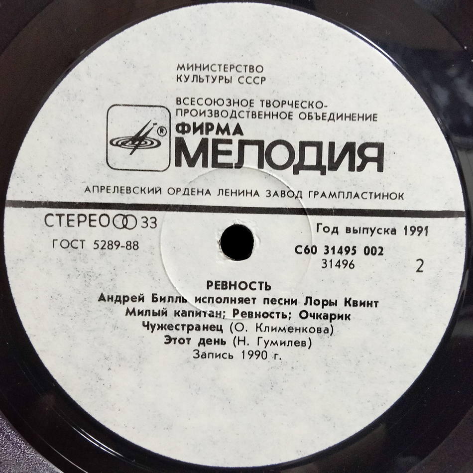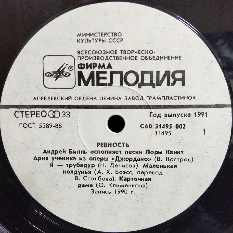 "Ревность" - студийный альбом советского и российского эстрадного певца Андрея Билля, выпущенный в 1991 году. В этом альбоме Андрей Билль исполняет песни Лоры Квинт. Автор слов – А. Х. Боэсс (трек: A3), Андрей Билль (трек: B1), Владимир Костров (трек: A1), Лора Квинт (трек: B1), Николай Гумилев (трек: B5), Николай Денисов (трек: A2), Ольга Клименкова (трек: A4, B2-B4). Музыка – Лора Квинт. Запись 1990 года.