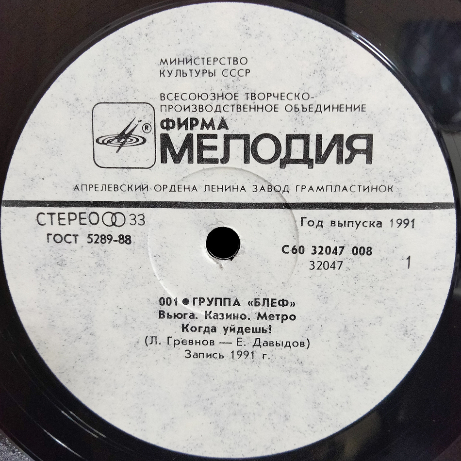 "001" - студийный альбом советской поп-рок-группы Блеф, выпущенный в 1991 году. Пластинка включает восемь композиций: "Вьюга", "Казино", "Метро", "Когда Уйдёшь?", "Таял Снег", "Час за Часом", "Цыгане" и "Тройка". Альбом представляет собой яркий образец русского рока начала 90-х годов, отличающийся самобытным звучанием и профессиональным исполнением. Звукорежиссёр С. Ремезов. Запись 1991 года.