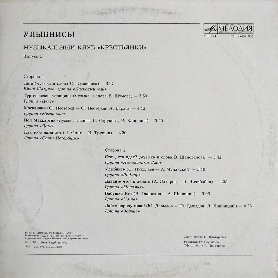 "Улыбнись! Музыкальный Клуб Крестьянки - Выпуск 3" - сборник поп-музыки от различных исполнителей, выпущенный в 1990 году. Содержит композиции в исполнении групп Ласковый Май, Центр, На-На и многих других. Релиз серии Музыкальный Клуб "Крестьянки" - №3. Запись 1989 года.