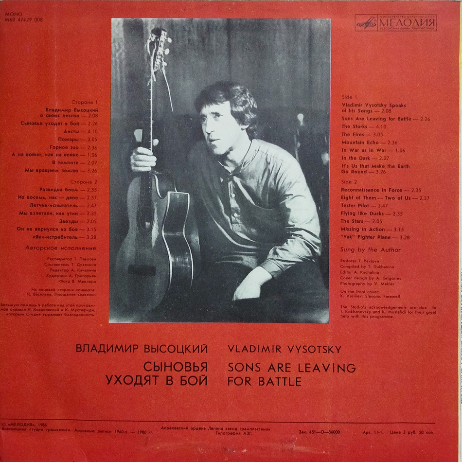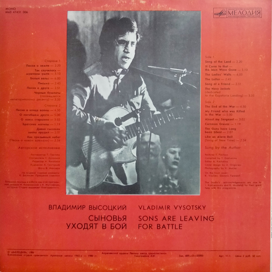"Сыновья Уходят В Бой - 1, 2" - комплект из двух сборников Владимира Высоцкого 1986 года. В сборник вошли архивные записи 1960-1980-х годов. Содержит такие треки как "Сыновья Уходят В Бой", "Песня О Земле", "Аисты" и многие другие.