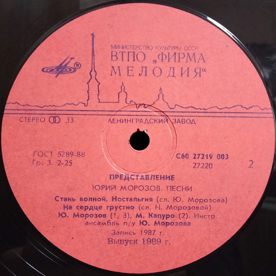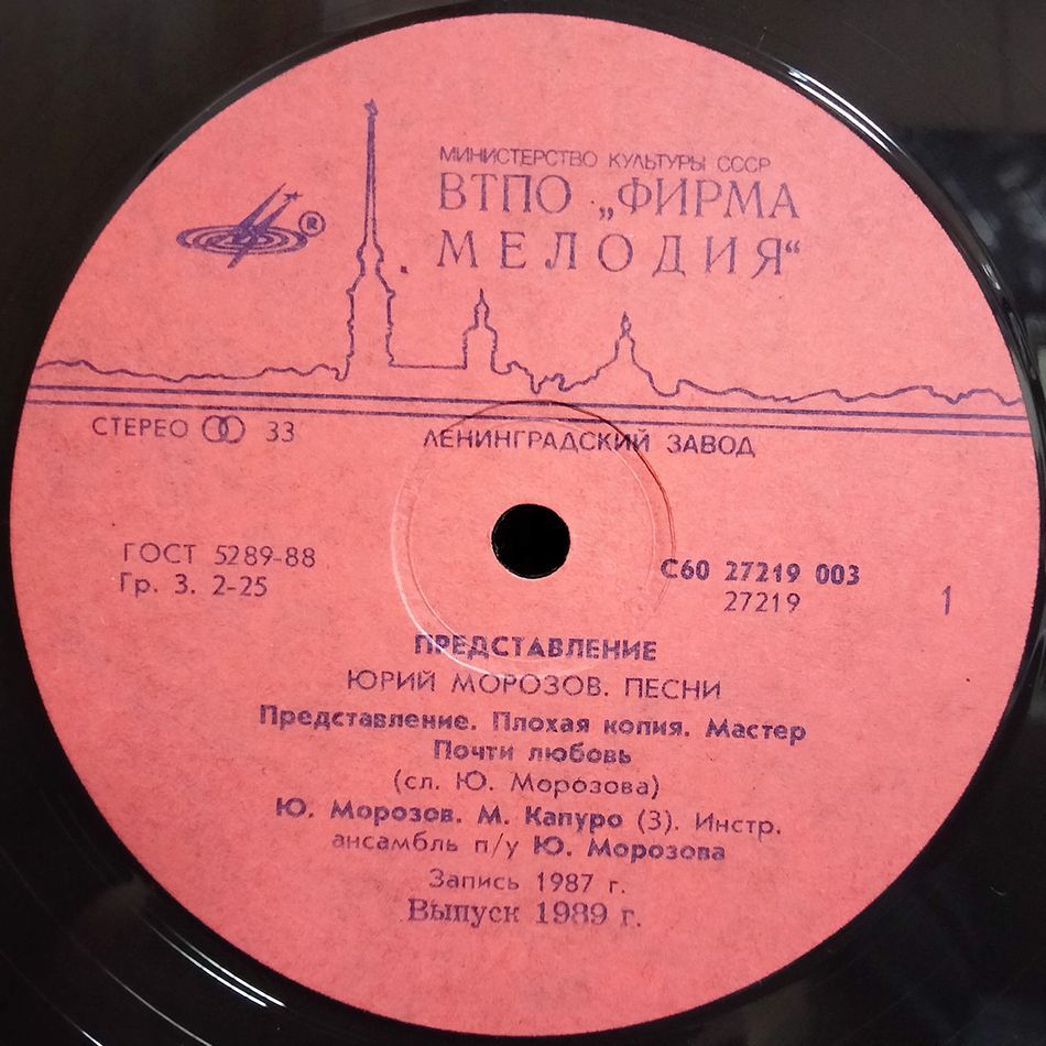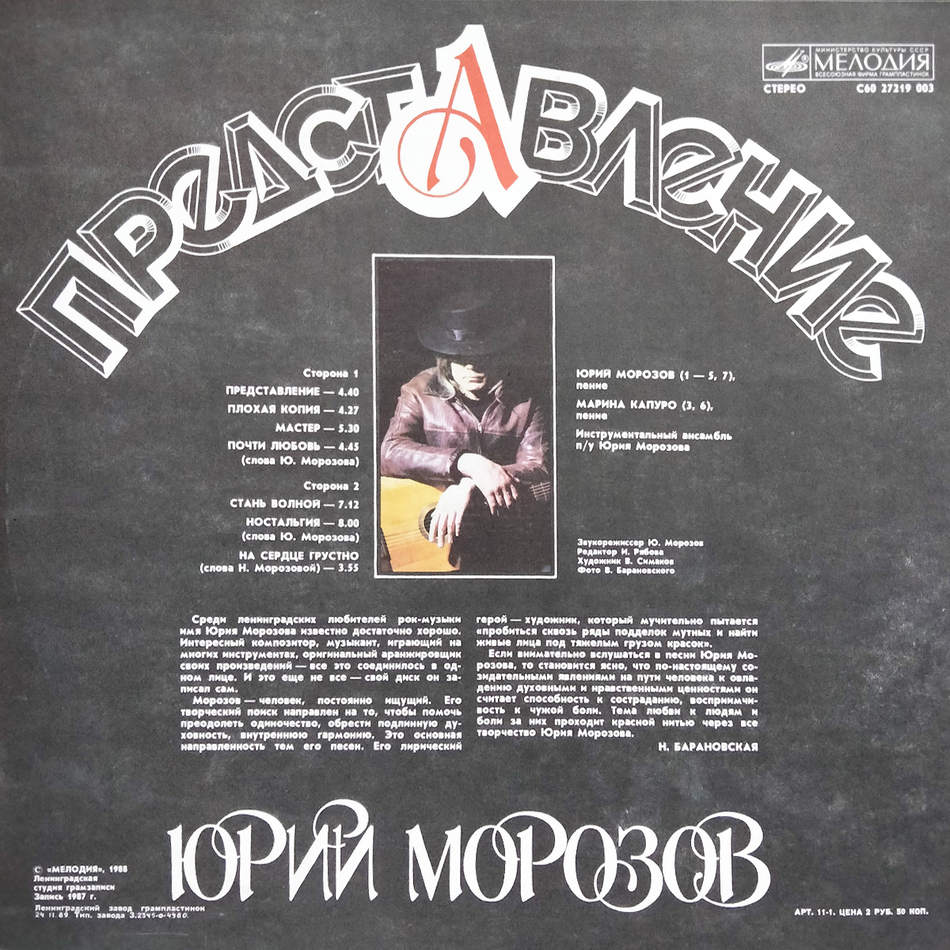 "Представление " - альбом советского и российского рок-музыканта Юрия Морозова, вышедший в 1988 году. В пластинку вошли такие значимые треки как "Представление", "Плохая Копия", "Мастер", "Почти Любовь", "Стань Волной", "Ностальгия" и "На Сердце Грустно". Альбом демонстрирует уникальный подход Морозова к звукозаписи как к творческому акту, где каждая композиция - это часть законченного художественного произведения. Запись 1987 года.