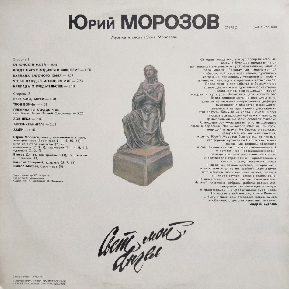 "Свет Мой, Ангел" - альбом советского и российского рок-музыканта Юрия Морозова, вышедший в 1992 году. В альбом вошли такие значимые треки как "От Юности Моей", "Когда Иисус Родился В Вифлееме", "Баллада Блудного Сына", "Свет Мой, Ангел" и "Amen". Каждая песня - это отдельная история, наполненная философскими размышлениями и душевной лирикой, где мелодичность и глубина текстов создают особую атмосферу умиротворения и внутренней гармонии. Записи 1980-1982 годов.