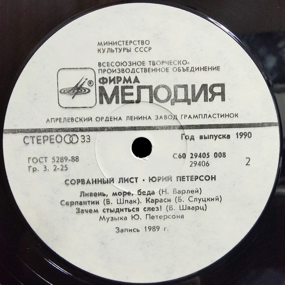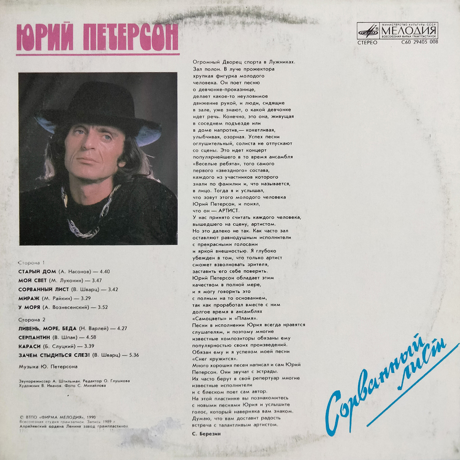 "Сорванный Лист" - студийный альбом советского и российского музыканта Юрия Петерсона, выпущенный в 1990 году. Звукорежиссер - А. Штильман. Музыка, Вокал - Ю. Петерсон. Запись 1989 года.